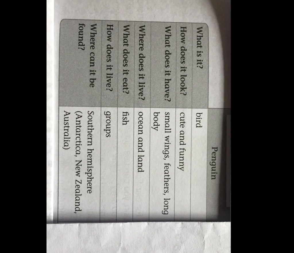 Bản dịch Tiếng Việt : Bạn có đoán được: loài chim nào có cánh nhưng không bay được không? Đây là một con chim cánh cụt. Loài chim này sống ở Nam Cực, nơi có tuyết lạnh quanh năm. Chúng thường cao khoảng 50 cm và có thân hình mập mạp và đầy đặn. Nó trông giống như một quả bí ngô mũm mĩm. Chúng có một lớp lông dày bao quanh cơ thể, lưng đen và bụng trắng giúp chúng tránh gió lạnh. Đặc biệt, chúng tuy không biết bay nhưng lại bơi rất giỏi. Đó là lý do tại sao luôn có những bữa ăn ngon với cá tươi. Họ sống cùng nhau và chăm sóc lẫn nhau. Với vẻ ngoài tròn trịa dễ thương của mình, chim cánh cụt xứng đáng là loài chim dễ thương nhất Nam Cực phải không nào?