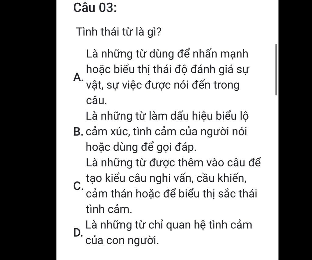 `=>C` Là những từ được thêm vào câu để tạo câu nghi vấn, câu cầu khiến, câu cảm thán và để biểu thị sắc thái tình cảm.