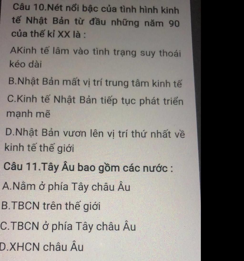 10.A ->Từ những năm 90 của thế kỉ XX, kinh tế Nhật Bản lâm vào tình trạng suy thoái nhưng Nhật Bản vẫn là một trong ba trung tâm kinh tế – tài chính của thế giới.
