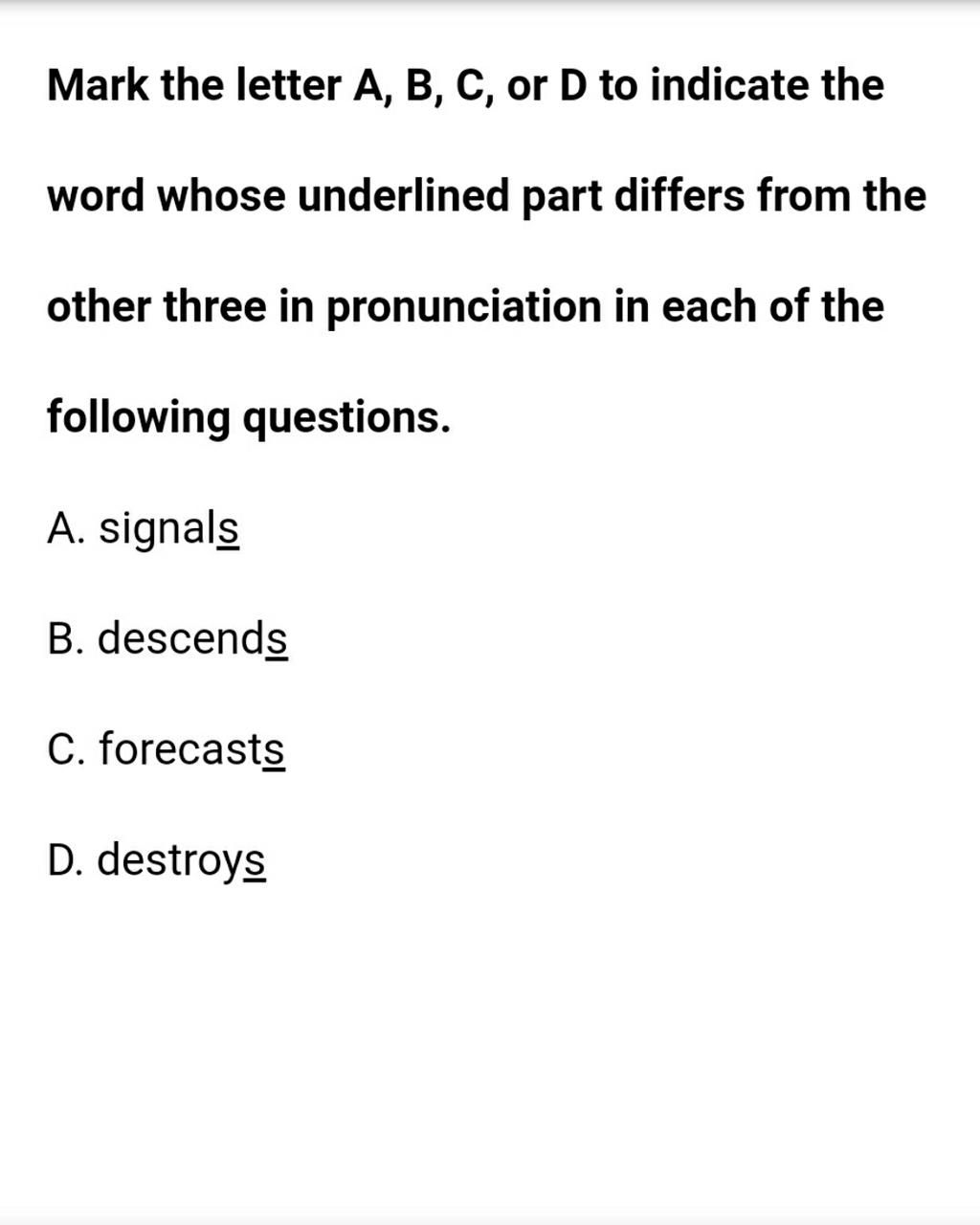 A. signals: s ở đây được phát âm là /z/ (quy tắc 3)