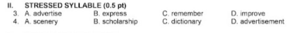 3. A (đáp án: nhấn âm đầu, còn lại: nhấn âm thứ 2)