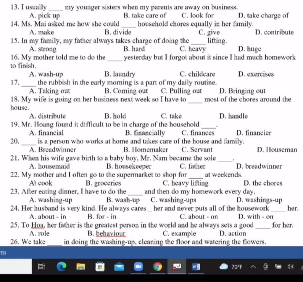 21. D. breadwinner ( trụ cột ; homemaker : ng nội trợ )