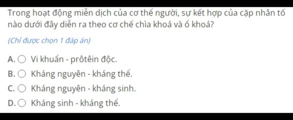 Giải thích các bước giải: Tương tác giữa kháng nguyên và kháng thể theo cơ chế chìa khóa và ổ khóa