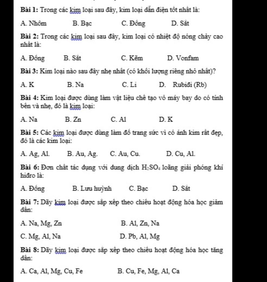 Bài 3: Kim loại nào sau đây nhẹ nhất (có khối lượng riêng nhỏ nhất)?