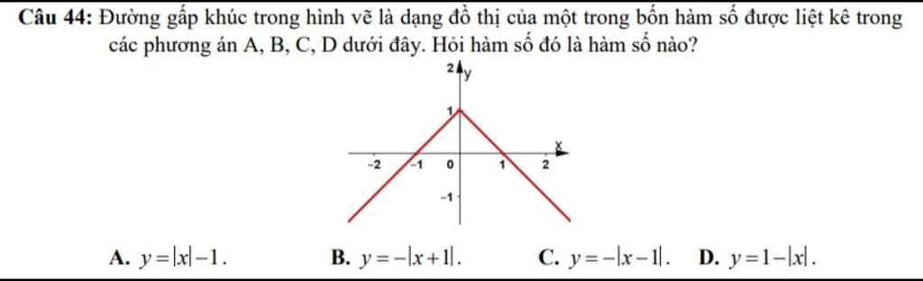 $A.y=|x|-1=\left\{\begin{array}{l} x-1 \text{ khi } x \ge 0 \\ -x-1 \text{ khi } x< 0\end{array} \right.$