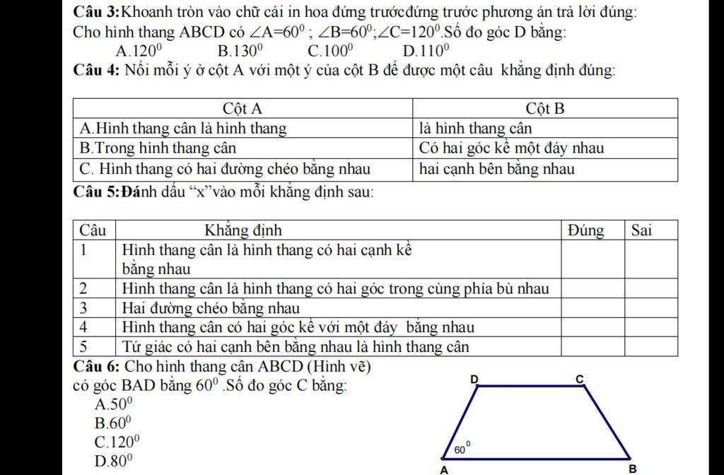 4 Hình thang cân có hai góc kề với một đáy bằng nhau ( Đ )