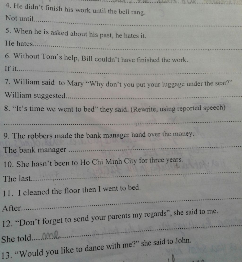 8. They said that it was time they had gone to bed. -> câu tường thuật -> lùi thì HTĐ -> QKĐ/ QKĐ -> QKHT