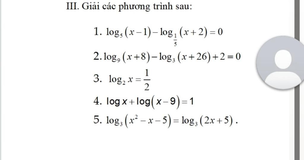 1) `\log_{5}\ (x-1)-\log_{1/5}\ (x+2)=0`