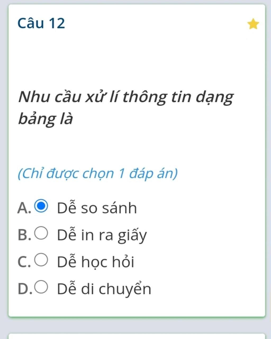 Giải thích : Nhu cầu xử lí thông tin dạng bản là: dễ dàng cho việc sắp xếp , so sánh , tính toán…