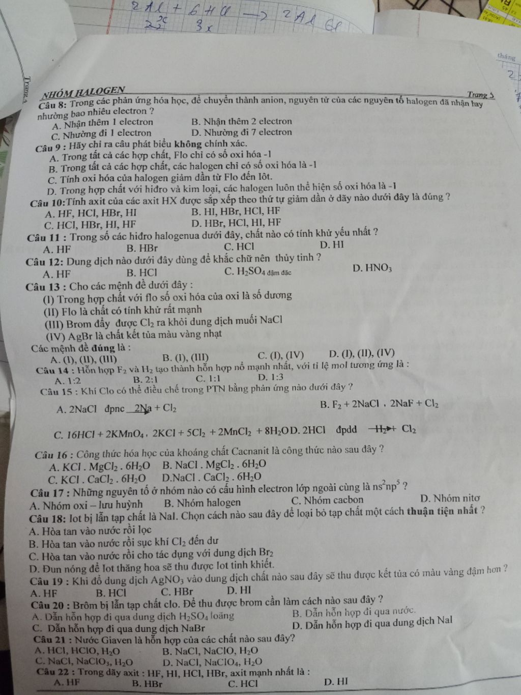 Cầu 8: Trong các phản ứng hóa học, để chuyên thành anion, nguyên tử của các nguyên tố halogen đã nhân hay