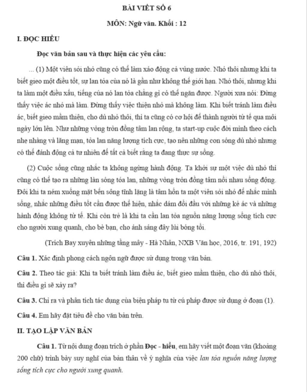 Trong cuộc sống, để bản thân mình được hạnh phúc thì việc lan tỏa nguồn năng lượng tích cực ra những người xung quanh cũng là điều vô cùng quan trọng. Thật vậy, khi chúng ta lan tỏa những điều hạnh phúc, tích cực ra xung quan thì chính chúng ta cũng đã nhận được những hạnh phúc. Ta vui vì đem hạnh phúc cho người khác, cũng như góp phần làm cho cuộc sống thêm ngập tràn niềm vui và sự tử tế. Dù cho cuộc sống nhiều khi có khắc nghiệt và tràn ngập những khó khăn thì việc mà con người cần làm vẫn chính là lạc quan, mạnh mẽ sống để theo đuổi lý tưởng sống của chính mình. Khi ta hạnh phúc với mọi thứ trong cuộc sống thì ta mới có thể đem đến nguồn năng lượng tích cực cho những người xung quanh. Chính vì vậy, cách chạm vào hạnh phúc thực sự là làm những việc nhỏ mà với tình yêu cực to lớn. Những giá trị hạnh phúc trong cuộc sống của con người đều được xuất phát từ những việc làm bé nhỏ mà mang đến hạnh phúc cho chính mình và người khác. Cách mà làm bản thân thấy hạnh phúc chính là sự cho đi, việc mà ta làm mọi thứ cho người khác bằng tất cả tình yêu và xúc cảm sâu thẳm trong trái tim. Khi con người thực sự cho đi, thì hạnh phúc và tình yêu thương đã lan tỏa. Dù chỉ bằng những việc làm rất nhỏ nhặt nhưng nó chứa đựng cả tấm lòng và sự quan tâm của người cho. Sự cho đi của cuộc sống này thực sự đa dạng, ta có thể cho đi nụ cười, cho tấm lòng, cho của cải, cho tình thương,...; cho tất cả những gì trong khả năng mà chúng ta có. Nhờ sự cho đi mà ta thấy hạnh phúc vì người khác hạnh phúc. Lúc đó, con người cảm thấy mình cũng nhận lại được một xúc cảm khó hiểu, nhưng nó hạnh phúc lâng lâng vì biết mình đã giúp ích được cho đời và những người xung quanh. Hơn nữa, nhờ có tình yêu thương và tấm lòng của con người, cuộc sống trở nên tươi đẹp hơn, con người có thể sống trọn vẹn hơn bao giờ hết. Chính vì vậy, cách để cảm thấy hạnh phúc chính là khi cho đi, đem đến nguồn năng lượng tích cực cho người xung quanh, hoặc khi ta làm những việc nhỏ nhưng chứa chan những xúc cảm từ tận đáy lòng. Tóm lại, việc cho đi những nguồn năng lượng tích cực hay cho đi những thứ mà trong khả năng của chúng ta chính là mang đến hạnh phúc cho người khác; nhờ sự cho đi này mà ta đang góp phần xây dựng nền tảng của một cuộc sống hạnh phúc và tốt đẹp, nơi mà con người có thể yêu thương và sống với nhau.