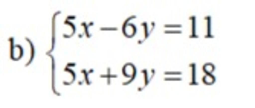 `{(5x-6y=11),(5x+9y=18):}`