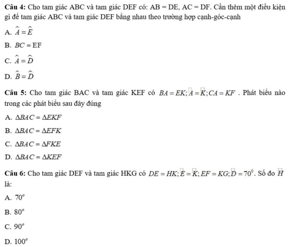 Câu 5: Cho tam giác BAC và tam giác KEF có BA= EK; A = K;CA = KF. Phát biểu nào