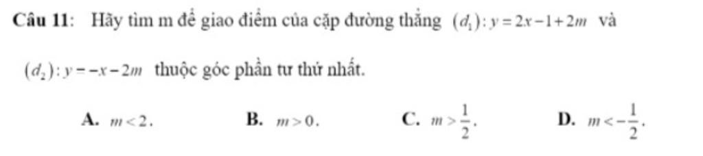 Để giao điểm của cặp đường thẳng `(d_1)` và `(d_2)` thuộc góc phần tư thứ nhất là: