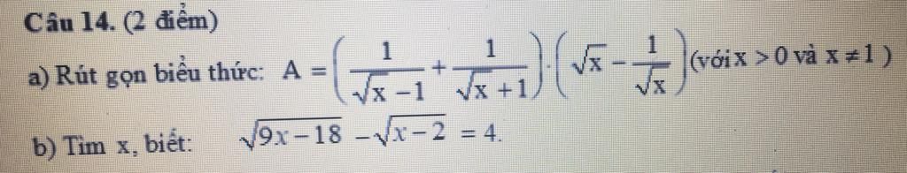 `a)A=(1/ sqrt(x-1)+1/sqrt(x+1))(sqrtx-1/sqrt(x))` (với `x>0,x\ne1`)