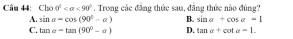 Cho ` 0 < a < 90 ` . Trong các khẳng định sau, đẳng thức nào đúng ?