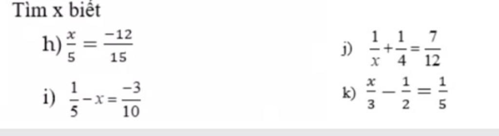 j) $\dfrac{1}{x}$ + $\dfrac{1}{4}$ = $\dfrac{7}{12}$