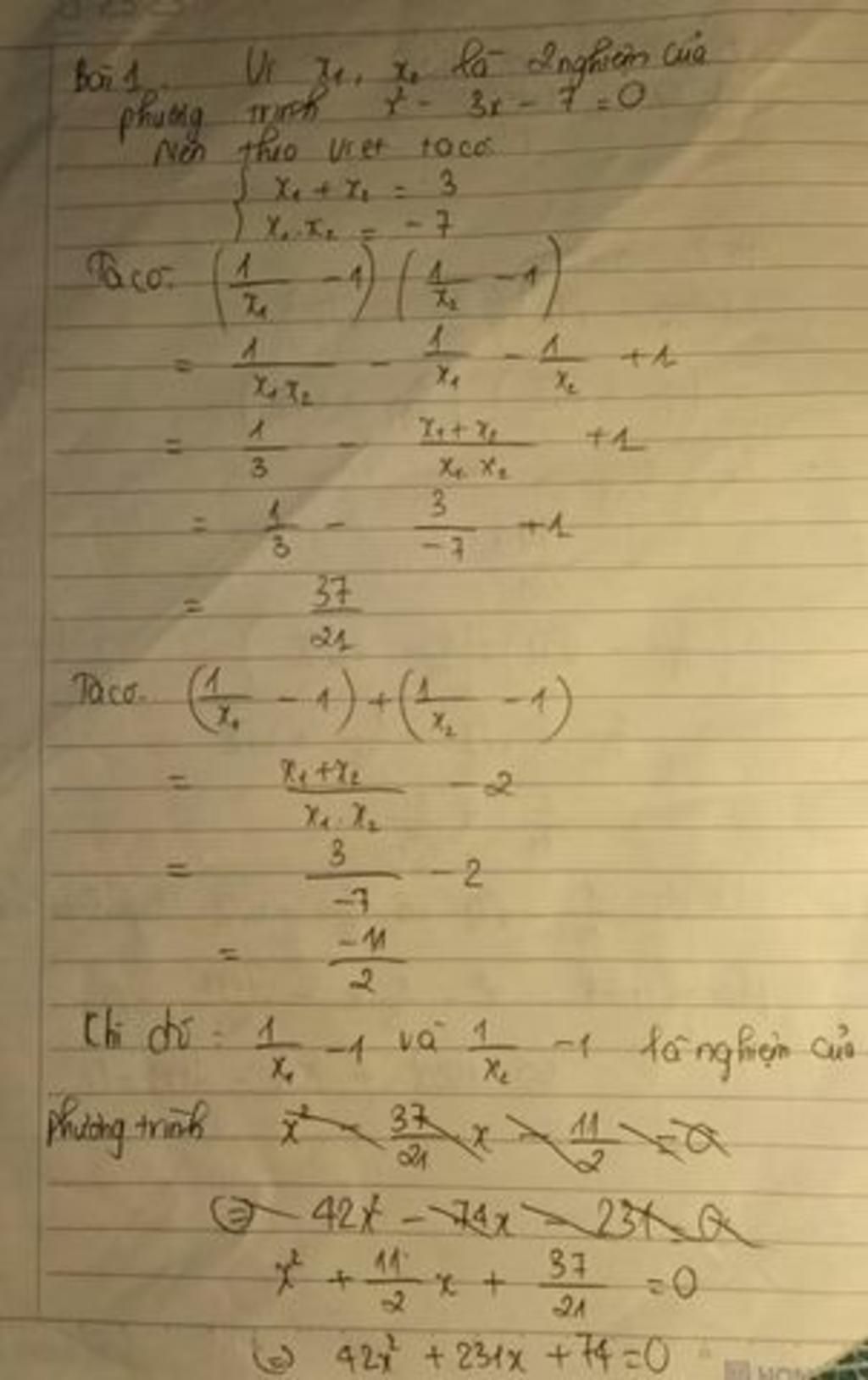 Bài 1: gọi x1; x2 là các nghiệm của phtr:x^2-3x-7=0.Lập phương triwnhf bậc hai có các nghiệm là 1/x1-1 và 1/x2-1