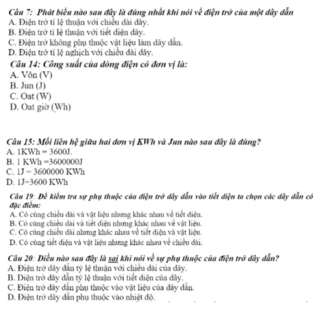 Câu19: A. Có cùng chiều dài và vật liệu nhưng khác nhau về tiết diện