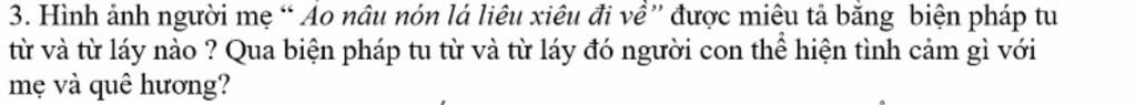 + Nếu với câu "Quê hương là dáng mẹ yêu áo nâu nón lá liêu xiêu đi về." thì lại sử dụng biện pháp tu từ so sánh với từ láy liêu xiêu. So sánh ở đây là vế "Quê hương" và "Dáng mẹ".