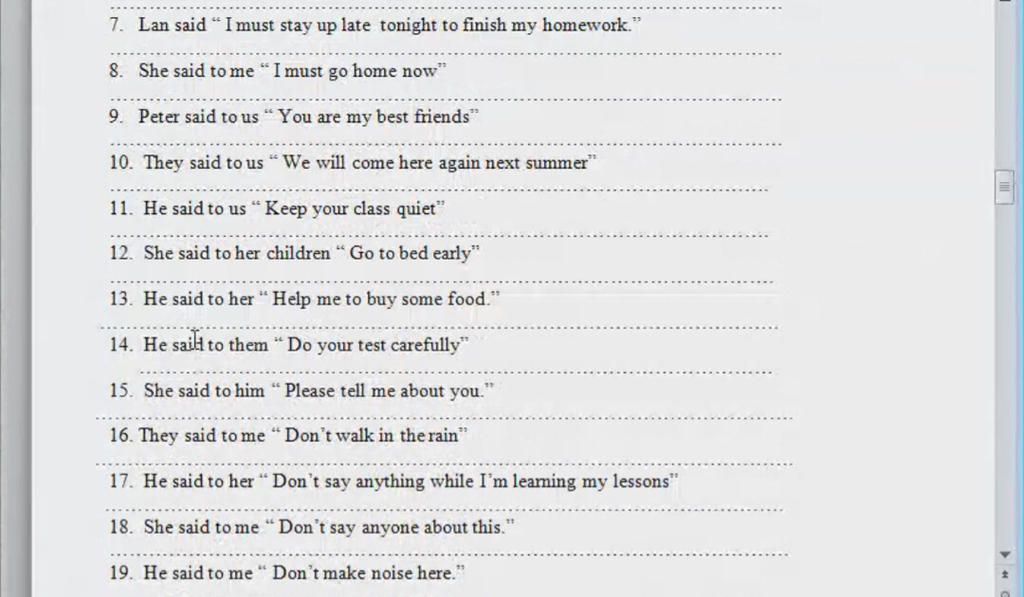 Câu 11 -> 19: Reported speech dạng commands/requests: