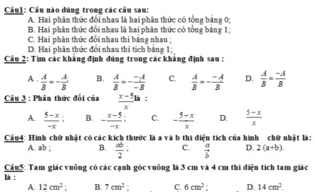 Câu 4: `A` (Diện tích hình chữ nhật = chiều dài . chiều rộng =`ab`)
