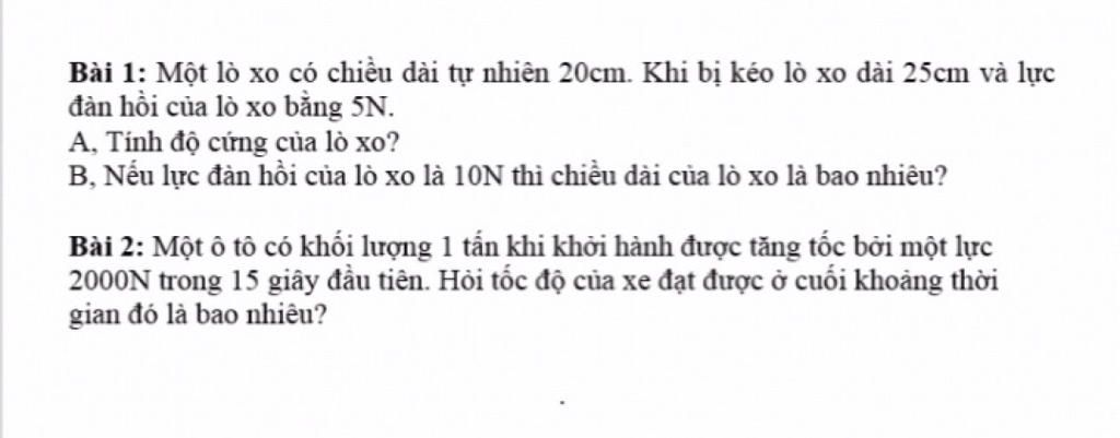 Bài 1: Một lò xo có chiều dài tự nhiên 20cm. Khi bị kéo lò xo dài 25cm và lực