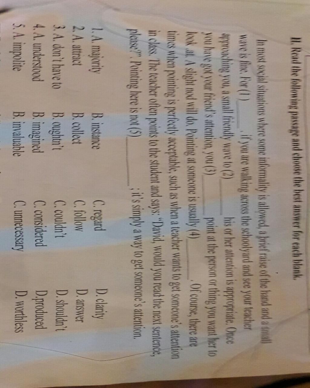 Dịch nghĩa: Trong hầu hết các tình huống xã hội cho phép sự không chính thức/ sự không theo khuôn khổ, bạn chỉ cần giơ tay và vẫy nhẹ là được. Ví dụ, nếu bạn đang đi ngang qua sân trường và thấy giáo viên của bạn tiến lại gần bạn, hãy vẫy tay chào thân thiện nhỏ để thu hút sự chú ý của giáo viên. Khi đã thu hút được sự chú ý của bạn bè, bạn không nên chỉ vào người hoặc vật mà bạn muốn cô ấy nhìn. Một cái gật đầu nhẹ sẽ làm được. Chỉ tay vào ai đó thường là một hành động thô lỗ . Tất nhiên, đôi khi việc chỉ tay là hoàn toàn có thể chấp nhận được, chẳng hạn như khi giáo viên muốn thu hút sự chú ý của ai đó trong lớp. Giáo viên thường chỉ vào học sinh và David, bạn có vui lòng đọc câu tiếp theo không? "Chỉ tay ở đây không phải là bất lịch sự, nó chỉ đơn giản là một cách để thu hút sự chú ý của ai đó.