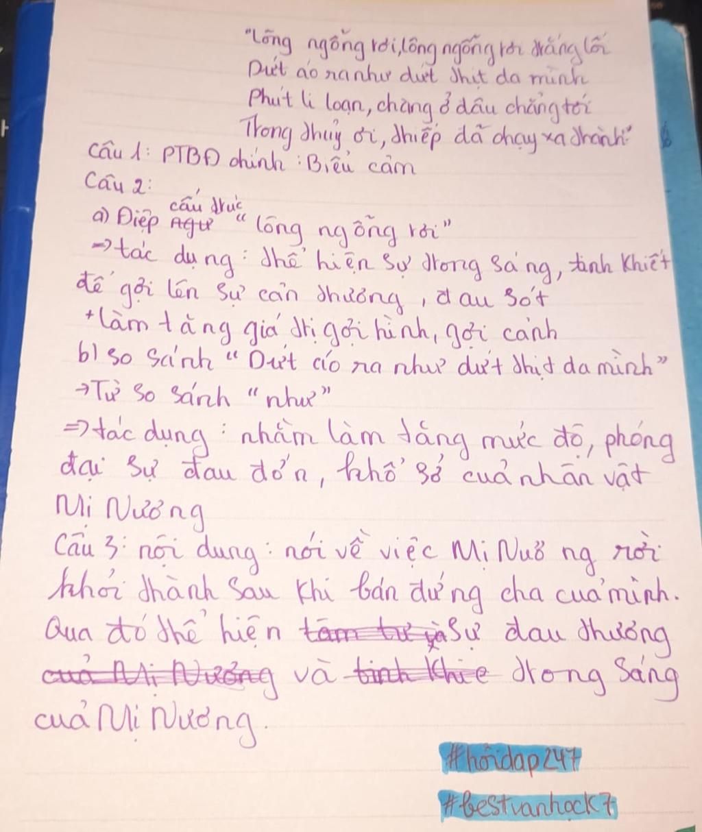 Nội dung đoạn thơ: Mị Châu sau khi bán đứng cha mình, cùng cha bỏ trốn, đoạn thơ trên trích trong chỗ trên đường đi rời khỏi kinh thành, nàng lấy lông ngỗng làm dấu báo hiệu, đồng thời có thể nàng lấy lông ngỗng trắng để thể hiện sự tinh khiết, cũng có thể để thể hiện sự vô tội và đau thương.
