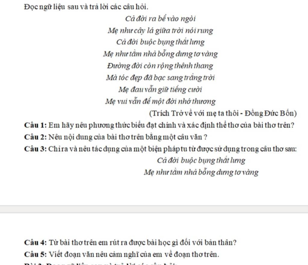4. Từ bài thơ trên, em rút ra được một bài học quý giá rằng : bản thân nên kính trọng, biết ơn, thương yêu, kính quý và tự hào về mẹ của mình. Và cần biết làm những công việc vừa sức minh để giúp đỡ mẹ.