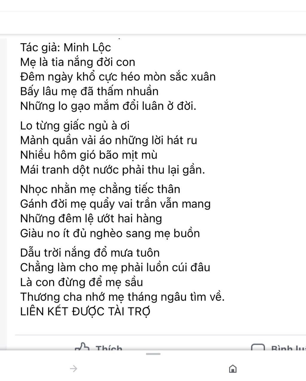 Đoạn 1 trong bài thơ này nêu cao sự cao đẹp và những gì mẹ h sinh vì con. Như đấng tạo hóa đã ban cho con một thiên sứ xuống để he chở và bảo vệ cho con vậy.Cả cuộc đời mẹ vẫn luôn kề cạnh con,sinh con ra vào lúc mẹ đang ở tuổi đẹp nhất của thanh xuân nhưng chẳng bao giờ oán hận gì.Mẹ mang nhiều tính cách đặc trưng chẳng giống ai.Bởi vì mẹ là duy nhất và cả cuộc đời này,con chỉ có duy nhất một người mẹ thôi. Mẹ nuôi nấng ta,cho ta những giây phút hạnh phúc và yêu thương ta đến trọn đời Đôi mắt ấy thường nhìn con bằng một cách trìu mến. Trong vũ trụ này có rất nhiều cái đẹp, nào là ngôi sao, nào là các hành tinh, tia sáng lấp lánh. Nhưng vẫn soi sáng, lấp lánh nhất chính là tình mẫu tử trên trái đất này. Tình mẫu tử là một tình yêu đẹp giữa mẹ và con mình. Mẹ là ngọn gió đưa con vào những giấc nồng ngon nhất bằng đôi tay mẹ. Con có lớn, có khôn thì con vẫn sẽ là đứa trẻ nhỏ bé và ngây thơ trong đôi mắt mẹ. Con rất tự hào vì cuộc đời này mẹ mãi là nguồn sáng dẫn lối cho con..Mẹ đã luôn vất vả trong sương gió cuộc đời, chỉ mong con mình được yên ổn và hạnh phúc.