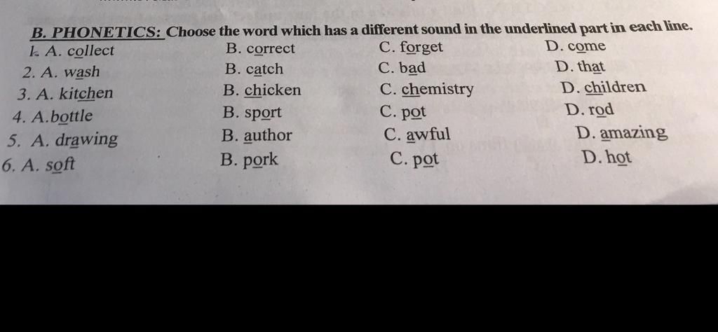6.A;C;D phát âm là ɒ ; còn B phát âm là ɔ: (chọn B)
