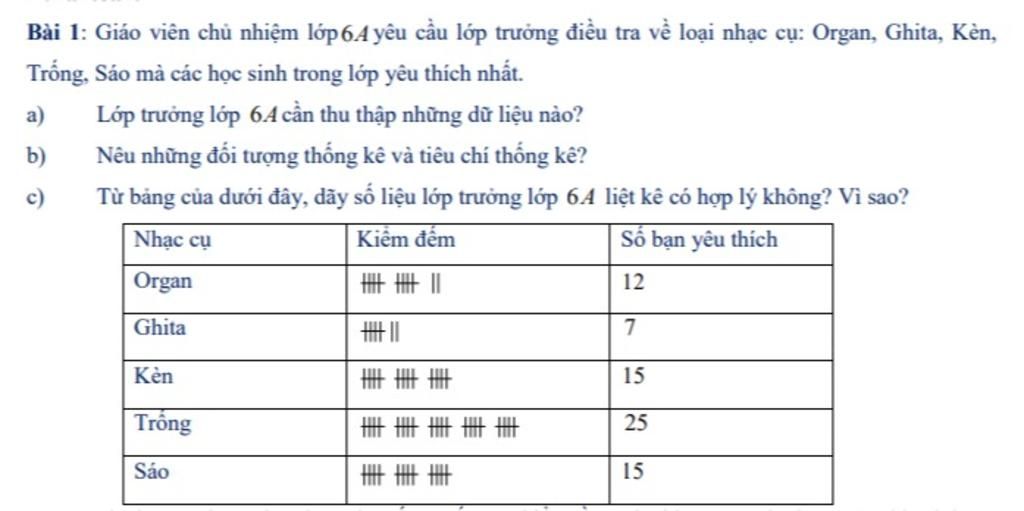 Bài 1: Giáo viên chủ nhiệm lớp 6.4 yêu cầu lớp trưởng điều tra về loại nhạc cụ: Organ, Ghita, Kèn,