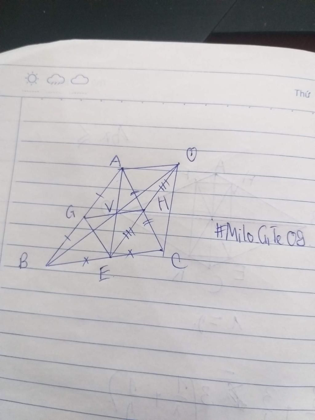 `=>V` là trung điểm của `GH` hay `GH` đi qua `V` (1)