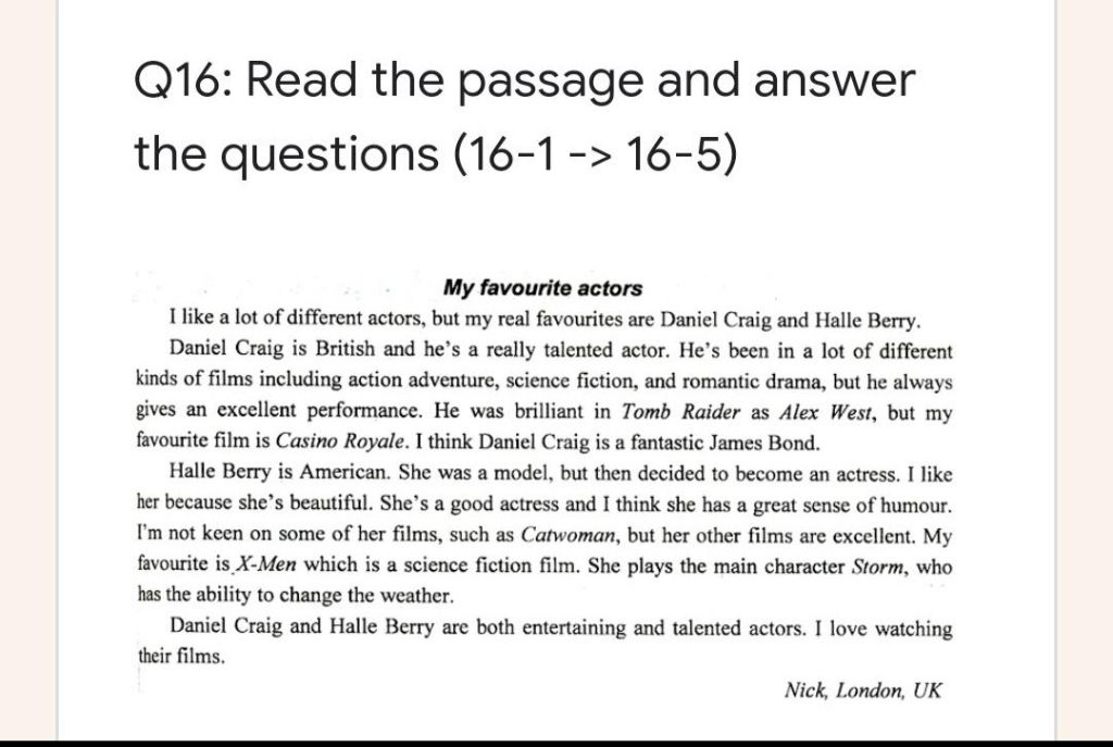 1:Nick's favorite actors are Daniel Craig and Halle Berry.