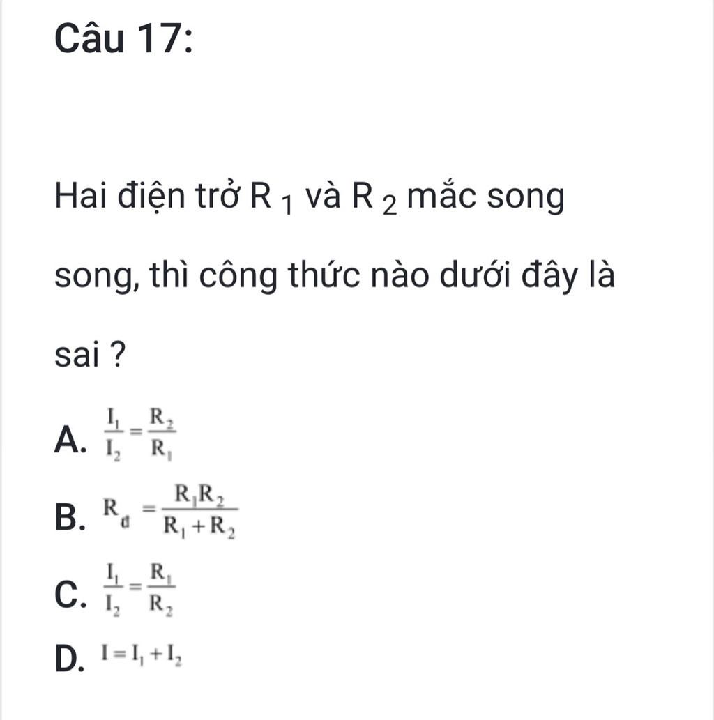 Câu17: Công thức sai là $\frac{I1}{I2}$ = $\frac{R1}{R2}$ ( Chọn C )