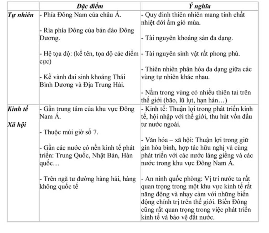 ⟹ Vị trí địa lí thuận lợi của nước ta có ý nghĩa rất quan trọng trong việc phát triển các ngành kinh tế, các vùng lãnh thổ, tạo điều kiện thực hiện chính sách mở cửa, hội nhập, thu hút vốn đầu tư nước ngoài