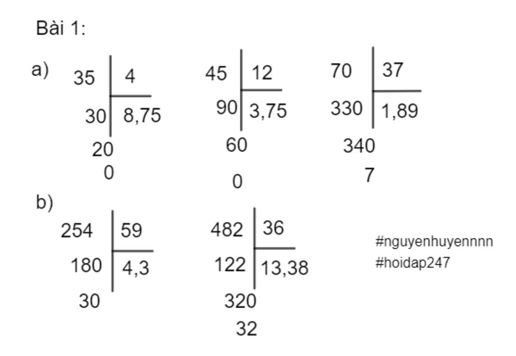 a) 35 : 4 = 8,75 ; 45:12 =3,75 ; 70 : 37 = 1,89 dư 07