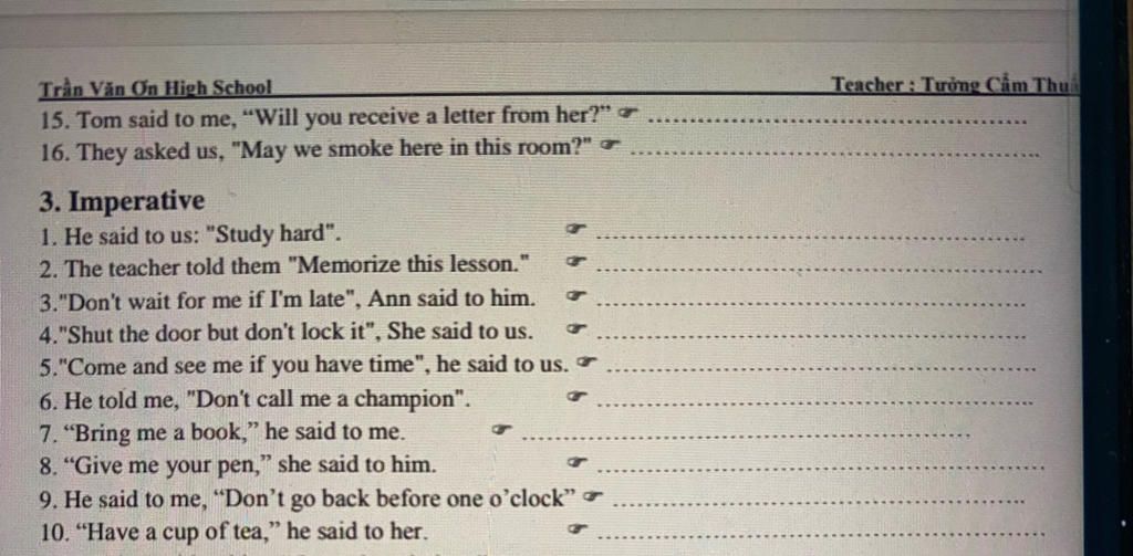 `-` Câu tường thuật mệnh lệnh: S + told + O + to-inf