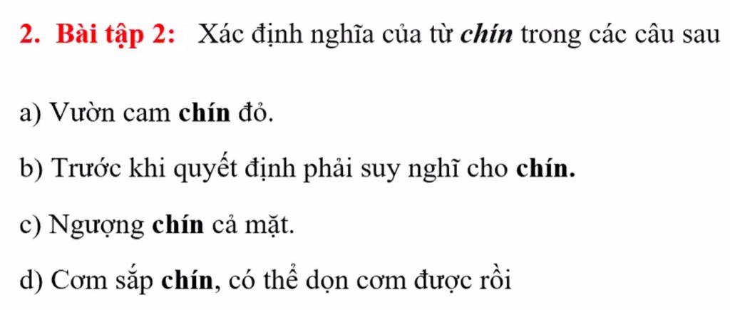 2. Bài tập 2: Xác định nghĩa của từ chín trong các câu sau: