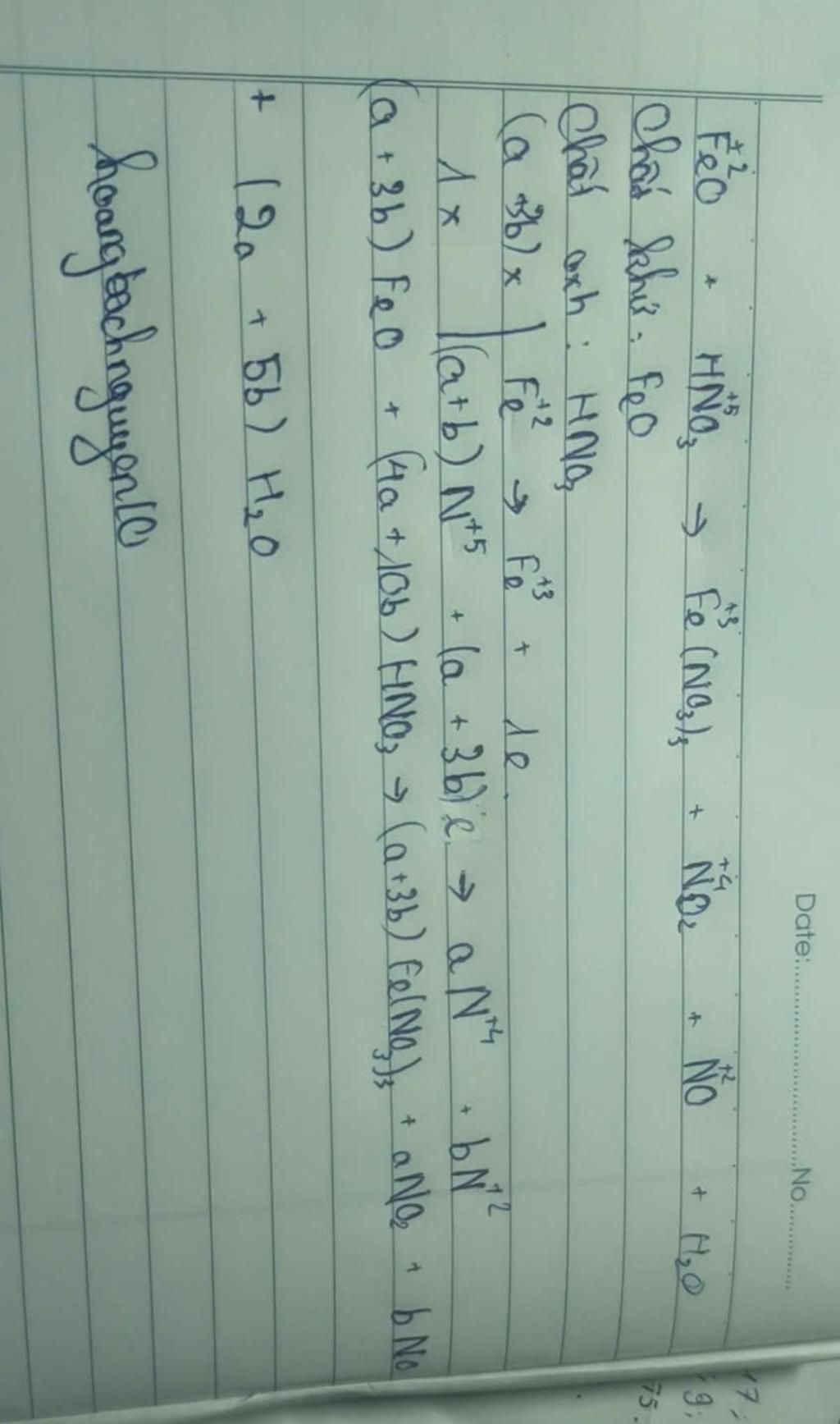 (a + 3b)FeO + (4a + 10b)HN{O_3} \to (a + 3b)Fe{(N{O_3})_3} + aN{O_2} + bNO + (2a + 5b){H_2}O