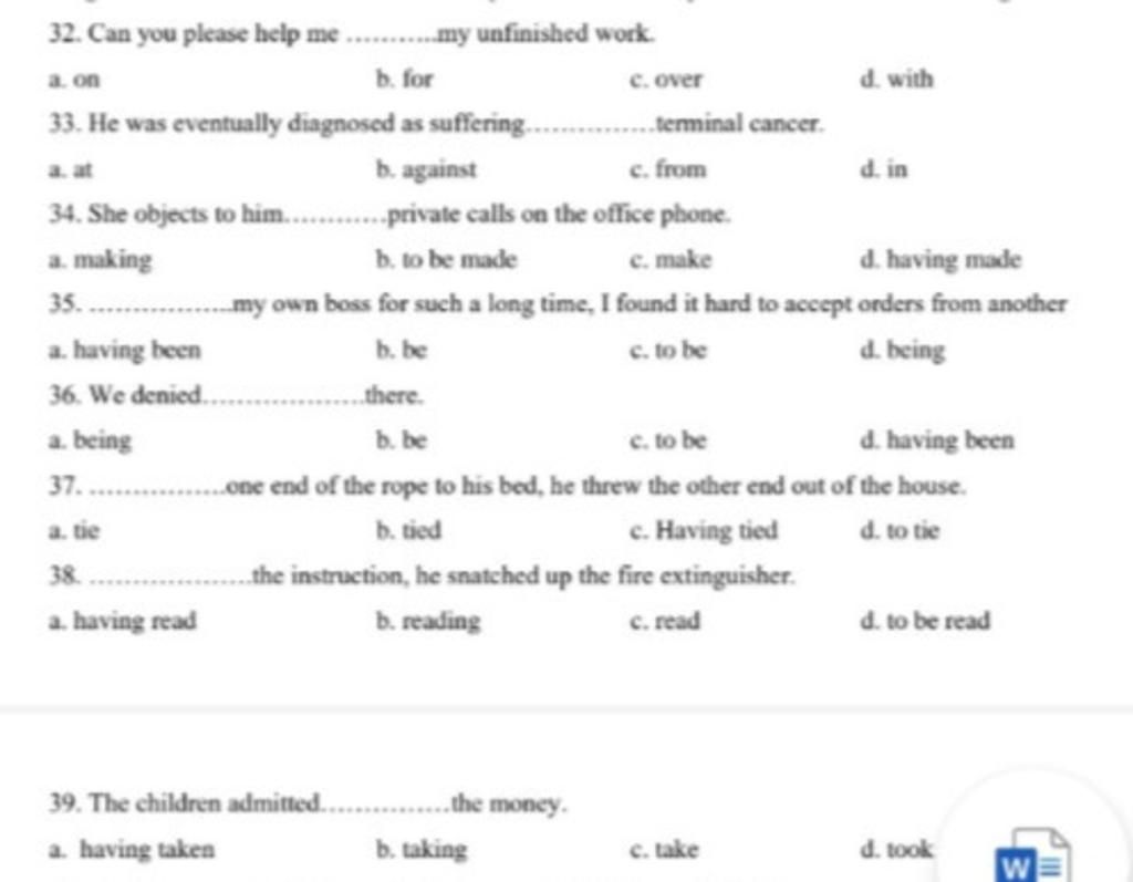 32. D --> help đi với giới từ "with" khi chỉ sự giúp đỡ