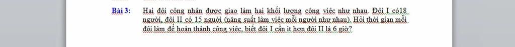 Do: đội `I` có `18` người , đội `II` có `15` người ( các công nhân làm việc với năng suất như nhau )