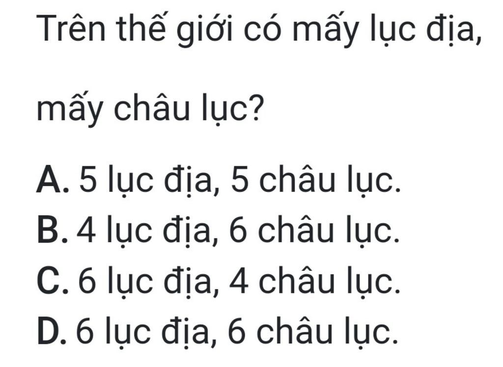 Thế giới có 6 châu lục và 6 lục địa đó là: