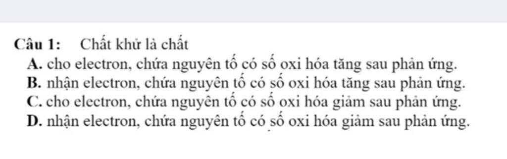 Chất khử là chất có số oxi hóa tăng sau phản ứng vì thế nên chất khử là chất cho electron