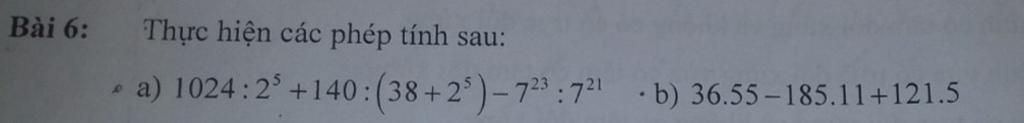 Vậy `1024 : 2^5 + 140 : ( 38 + 2^5 ) - 7^23 : 7^21 = - 15`