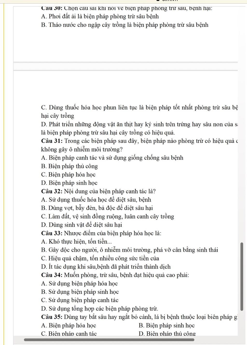 Câu 30. Chọn câu sai khi nói về biện pháp phòng trừ sâu, bệnh hại