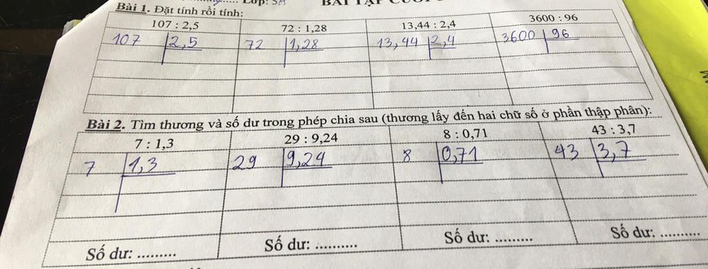 Bài 2. Tìm thương và số dư trong phép chia sau (thương lấy đến hai chữ số ở phần thập phân):