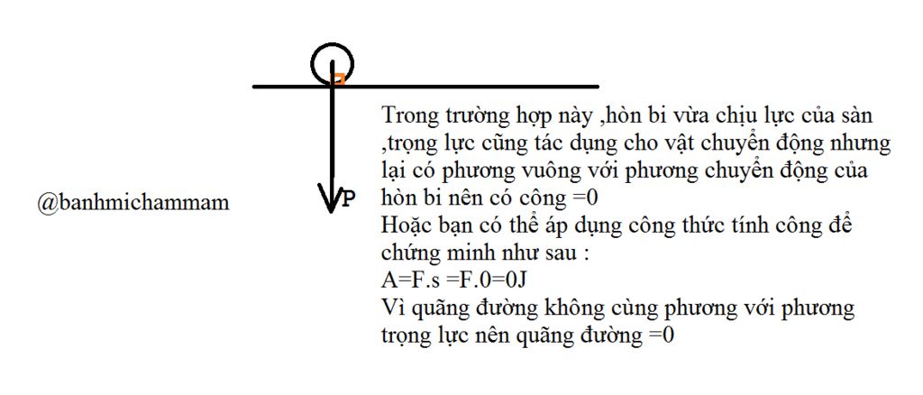 Khi hòn bi chuyển động trên mặt sàn nằm ngang, trọng lực có phương thẳng đứng, vuông góc với phương chuyển động của vật, nên không có công cơ học của trọng lực.