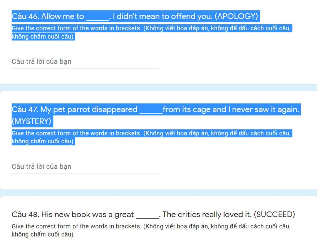 Give the correct form of the words in brackets. (Không viết hoa đáp án, không để dấu cách cuối câu,
